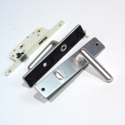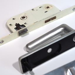 Bloc de poignée de porte avec verrou complet, prêt à poser sur une porte de 40 mm d’épaisseur, entraxe de fixation : 195 mm.