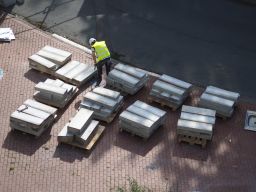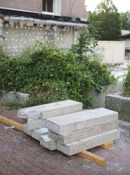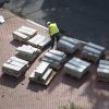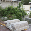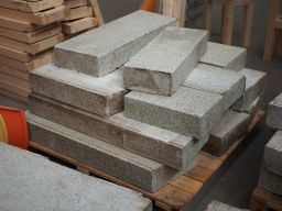 Palette de pierre de taille pour bordure de voirie, granite blanc sarde, finition grenaillée, tailles diverses et bords biseautés.