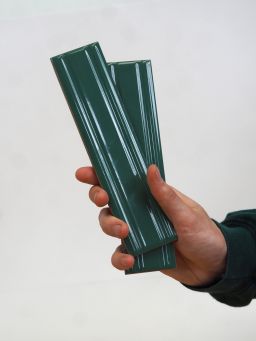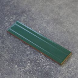 Listel mural à bords droits, surface à reliefs, en terre cuite émaillée, couleur verte.