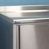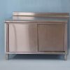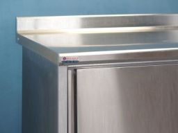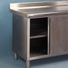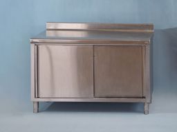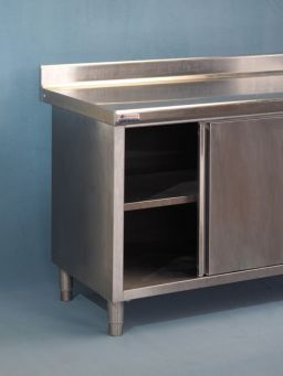 Meuble à dosseret en acier inox alimentaire, de marque TOURNUS EQUIPEMENT, deux portes coulissantes sur une face, une étagère réglable en hauteur, parois de portes et intérieurs doublés, bandeau avant rayonné, vérins réglables.