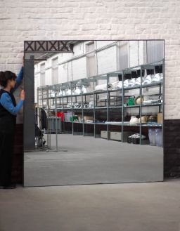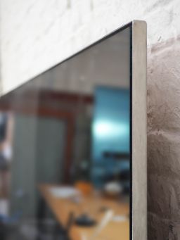 Grand miroir monté sur un panneau bois, avec un cadre en aluminium.