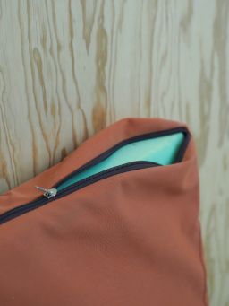 Matelas de mousse de marque MA MOUSSE SUR MESURE, réalisé sur mesure aux dimensions d’un panneau de contreplaqué standard, mousse de densité ferme : 30 kg/m³, housse en toile hydrofuge couleur terracotta.