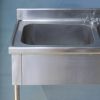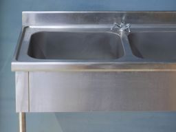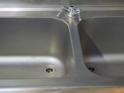 Plonge de cuisine professionnelle à dosseret, de marque TOURNUS EQUIPEMENT, deux bacs, vendu avec un robinet douchette.