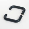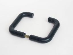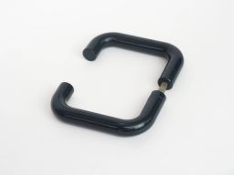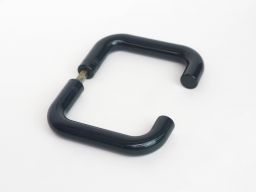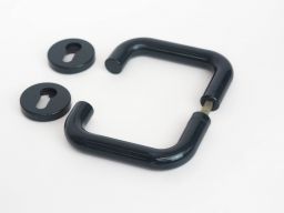 Poignée de porte béquille double contre-coudée, de marque HEWI, rosace de fonction ronde clé I, de couleur vert foncé.