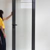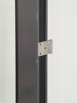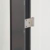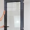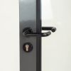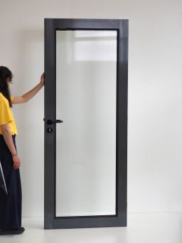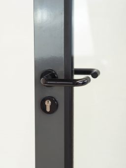 Porte vitrée en aluminium thermolaqué gris anthracite, équipée d’une poignée de porte en nylon noir montée sur rosace ronde.