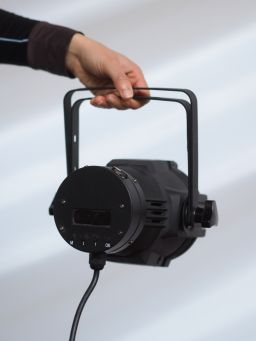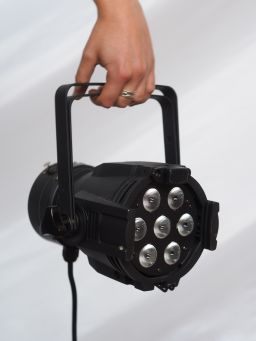 PAR de scène compact de marque STAIRVILLE, modèle Mini Stage Par 7x4W RGB WW, avec mélange de couleurs quadrichromie de rouge, vert, bleu et blanc chaud, double support.